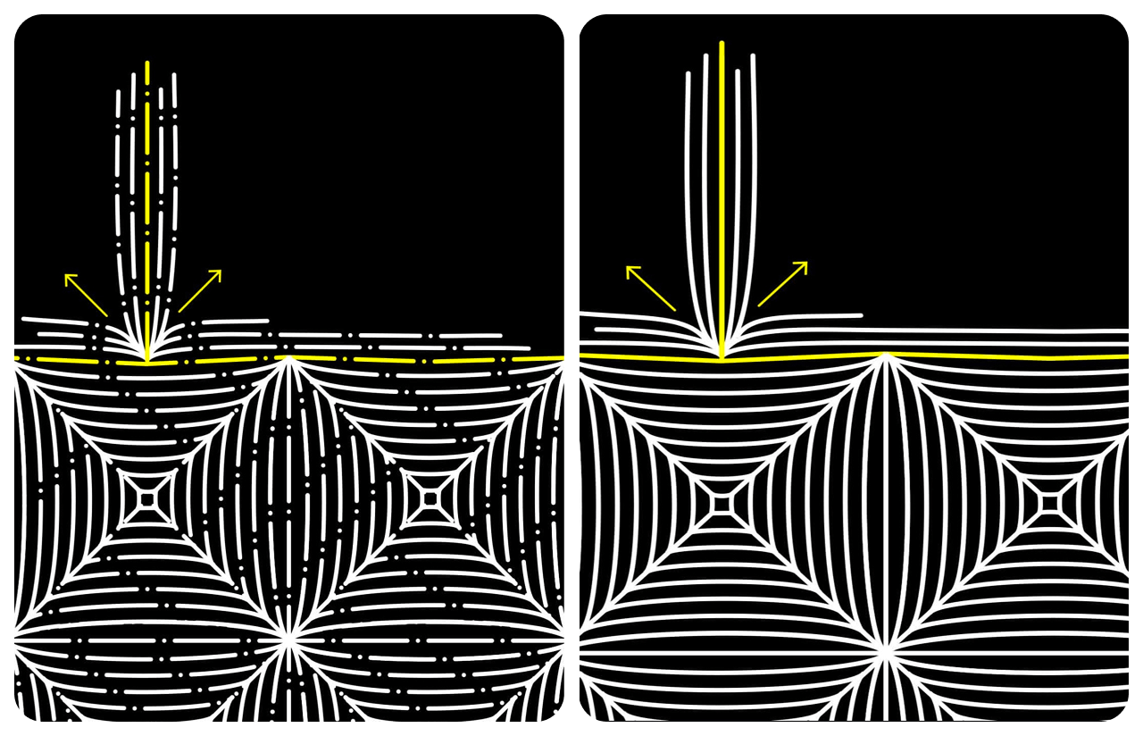 Quando applicato a una configurazione di celle, il metodo assume come condizione iniziale i nodi della struttura, che funzionano da poli di propagazione. Le linee avanzano progressivamente verso l’interno fino a incontrarsi. La zona di saturazione che ne deriva non è imposta come centro a priori: emerge dall’interazione tra le propagazioni. In configurazioni simmetriche può coincidere con il centro geometrico; in configurazioni asimmetriche può spostarsi o articolarsi in più punti di equilibrio.