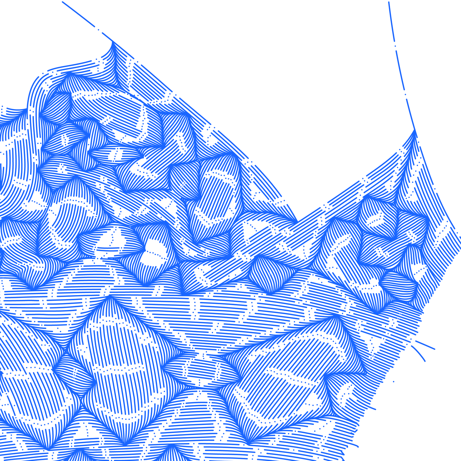 Con l’avanzare del disegno, le curve che procedono dai lati verso l’interno si incontrano. Da questi incontri emergono nuove intersezioni (nodi), che diventano a loro volta nuovi poli. La propagazione riparte da questi punti, permettendo di occupare e chiudere lo spazio rimasto vuoto.