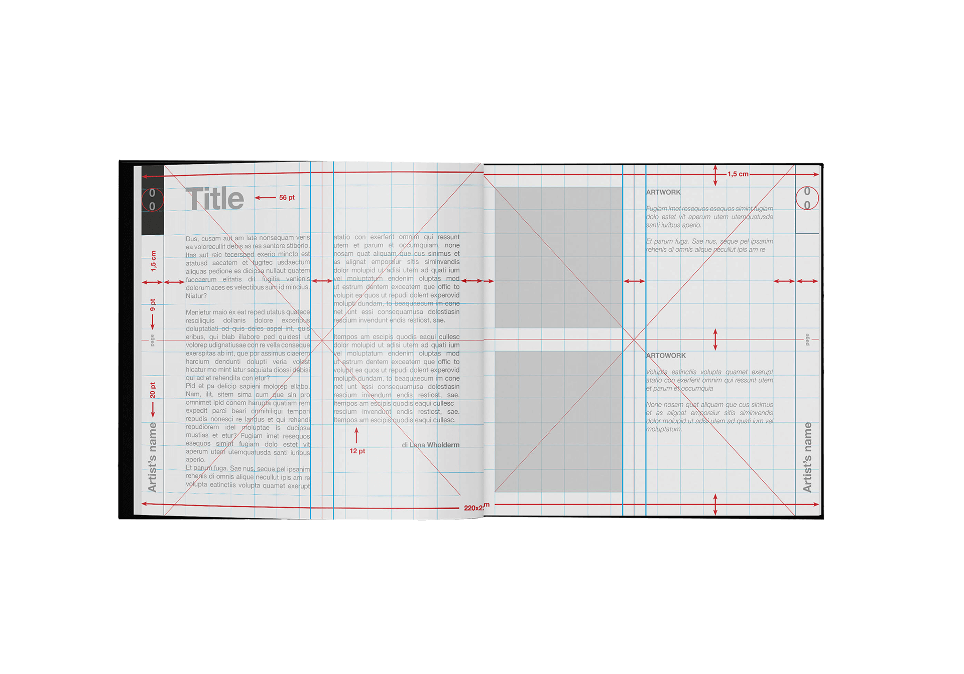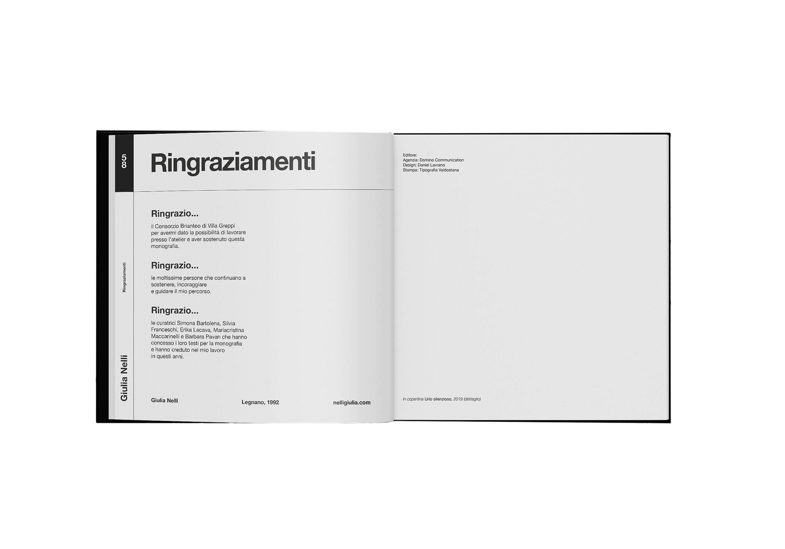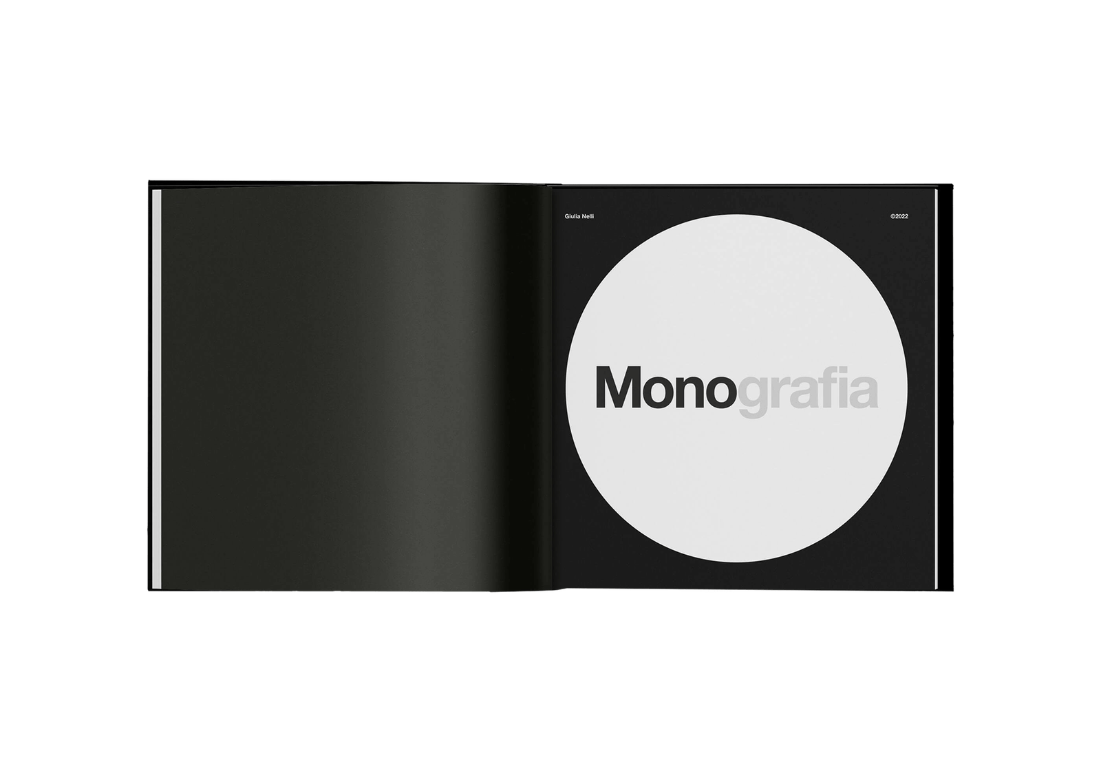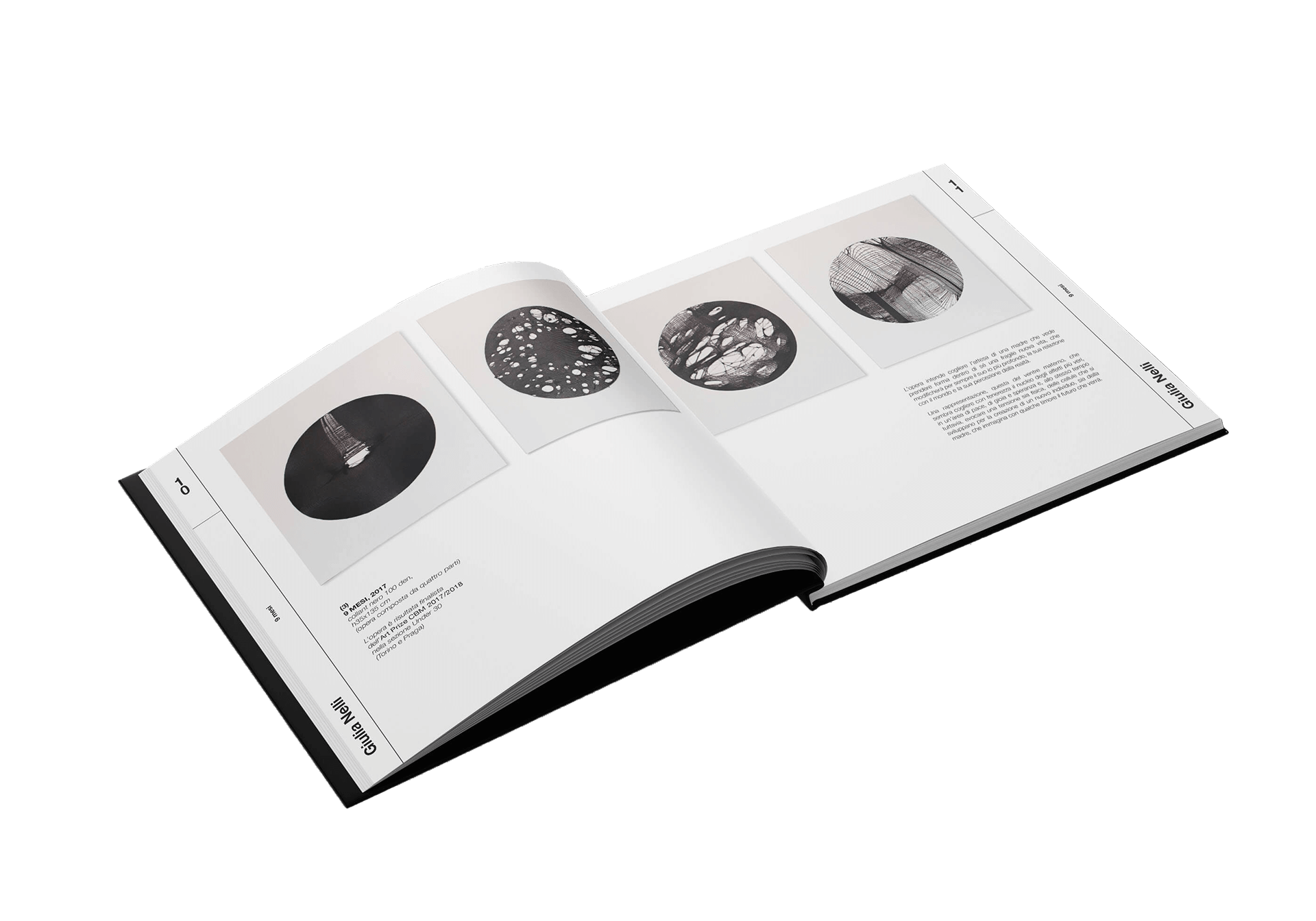 Il progetto è stato sviluppato nell’ambito di una collaborazione con Domino Communication, agenzia di comunicazione coinvolta nella produzione editoriale. La pubblicazione è stata progettata con un’impostazione rigorosa e minimale, lasciando ampio spazio alle opere e riducendo al minimo gli elementi superflui. La scelta tipografica di Helvetica Neue e una palette in bianco e nero definiscono un tono netto e contemporaneo, supportato da una griglia pulita e da gerarchie chiare tra testi, didascalie e immagini. Il risultato è un oggetto editoriale coerente, elegante e funzionale alla lettura, pensato per valorizzare il ritmo, i contrasti e i dettagli del lavoro dell’artista.