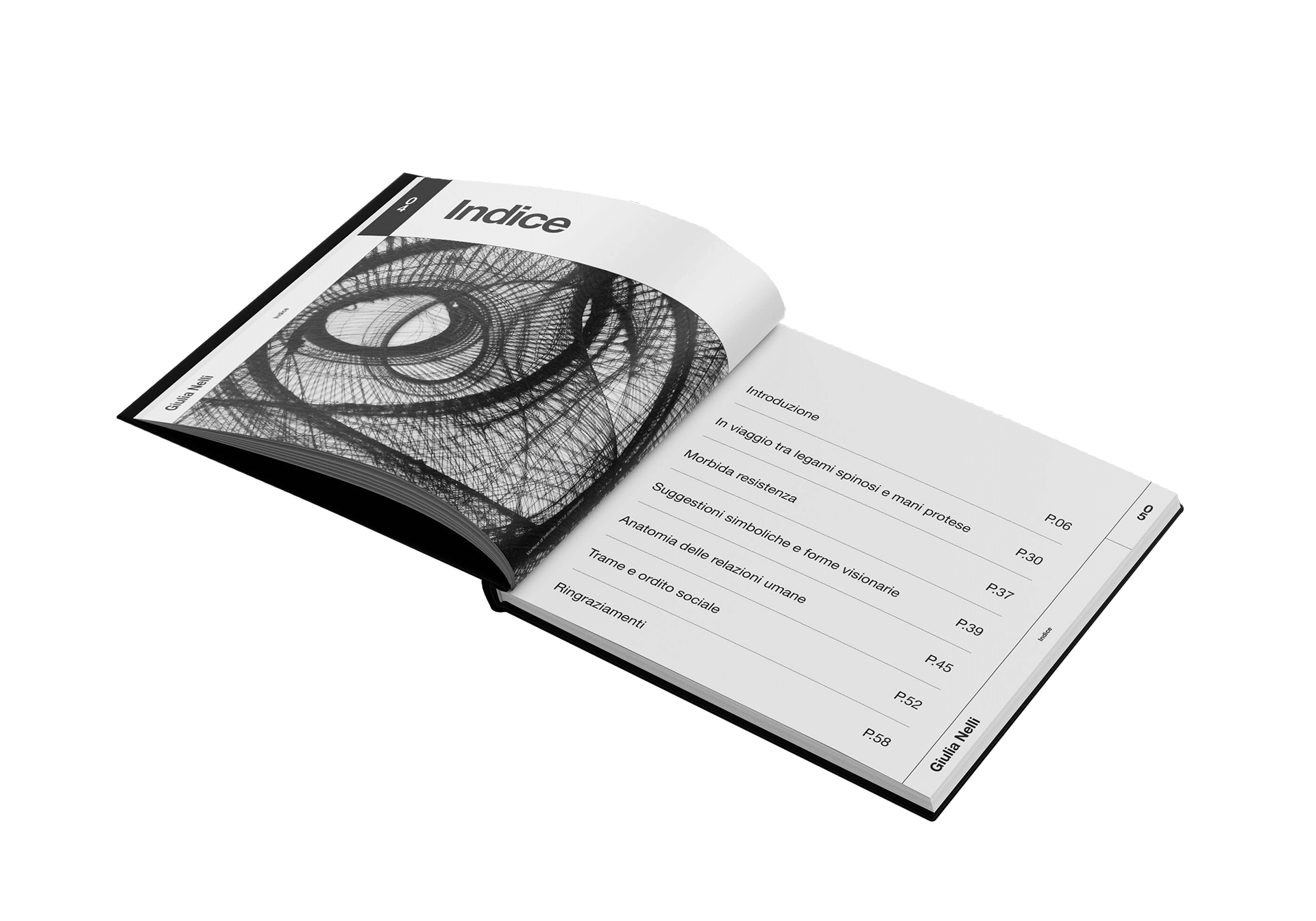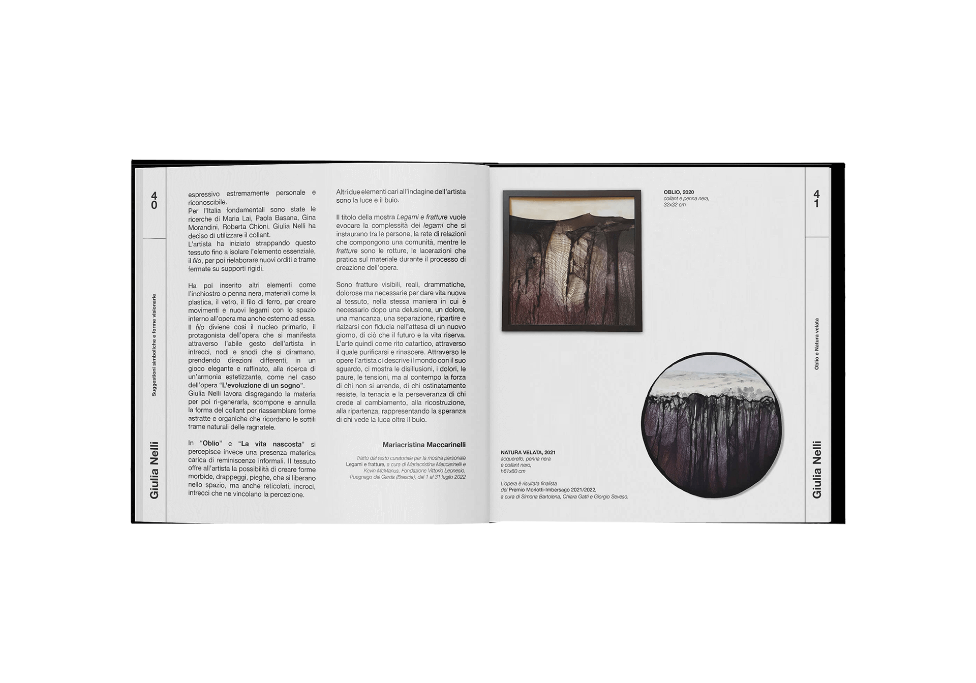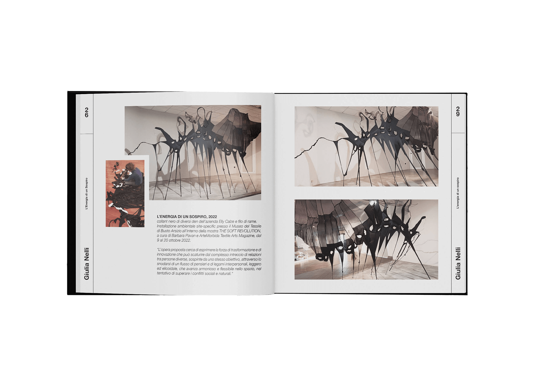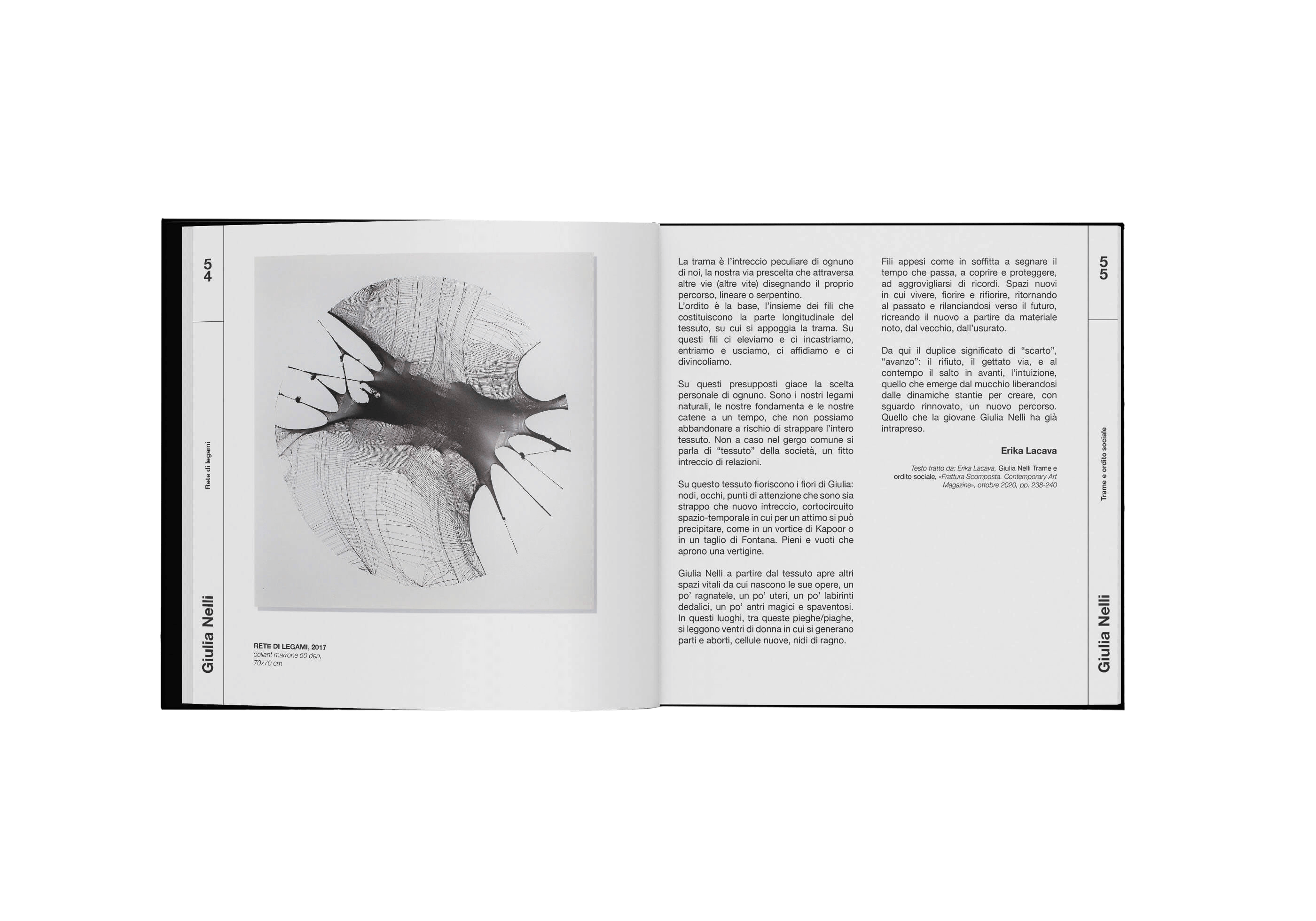 Progetto editoriale per la monografia di presentazione del libro di Giulia Nelli, artista che utilizza le calze a rete come elemento materico e concettuale nelle proprie opere.
