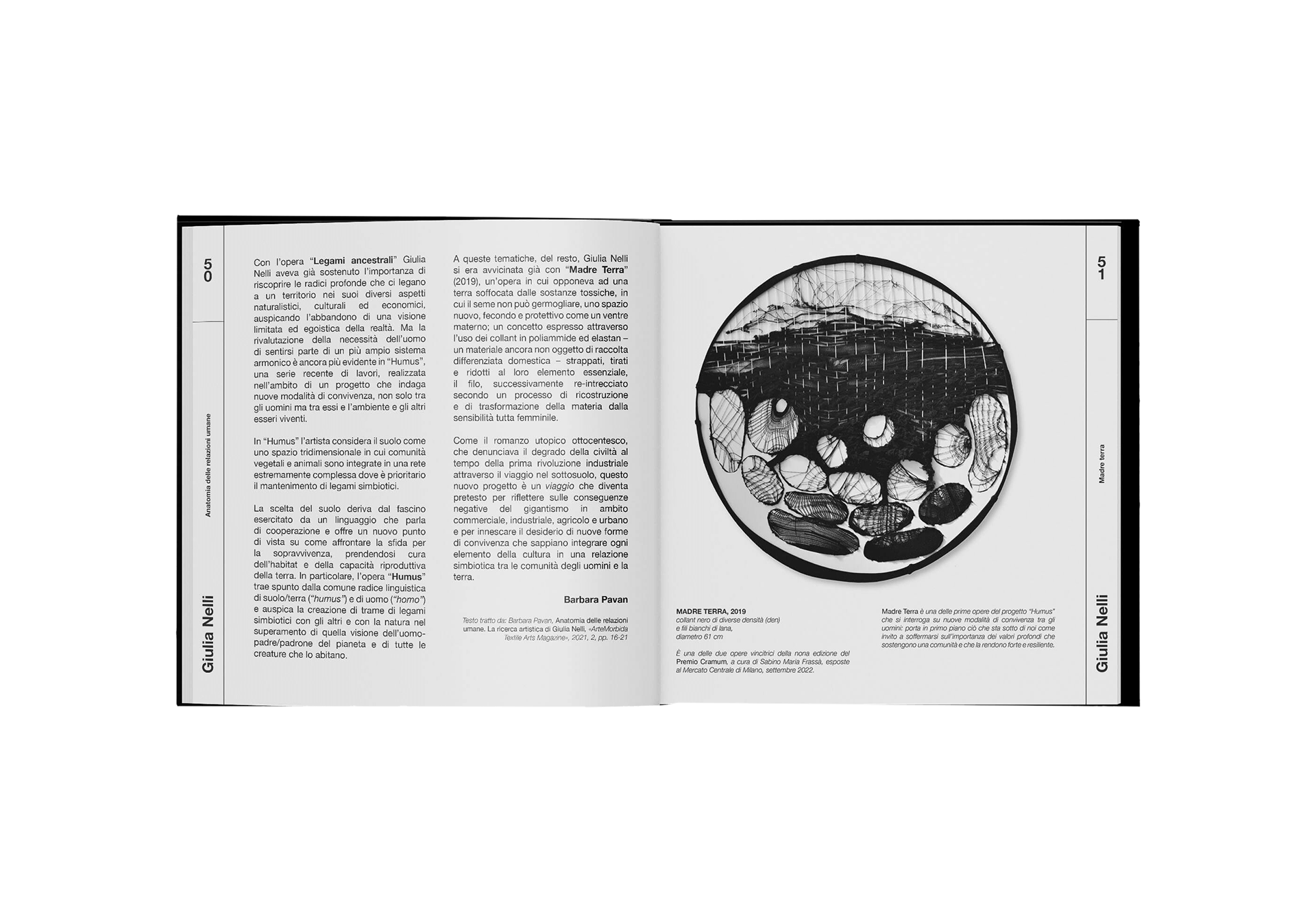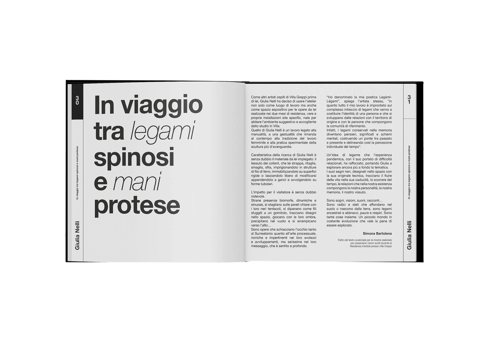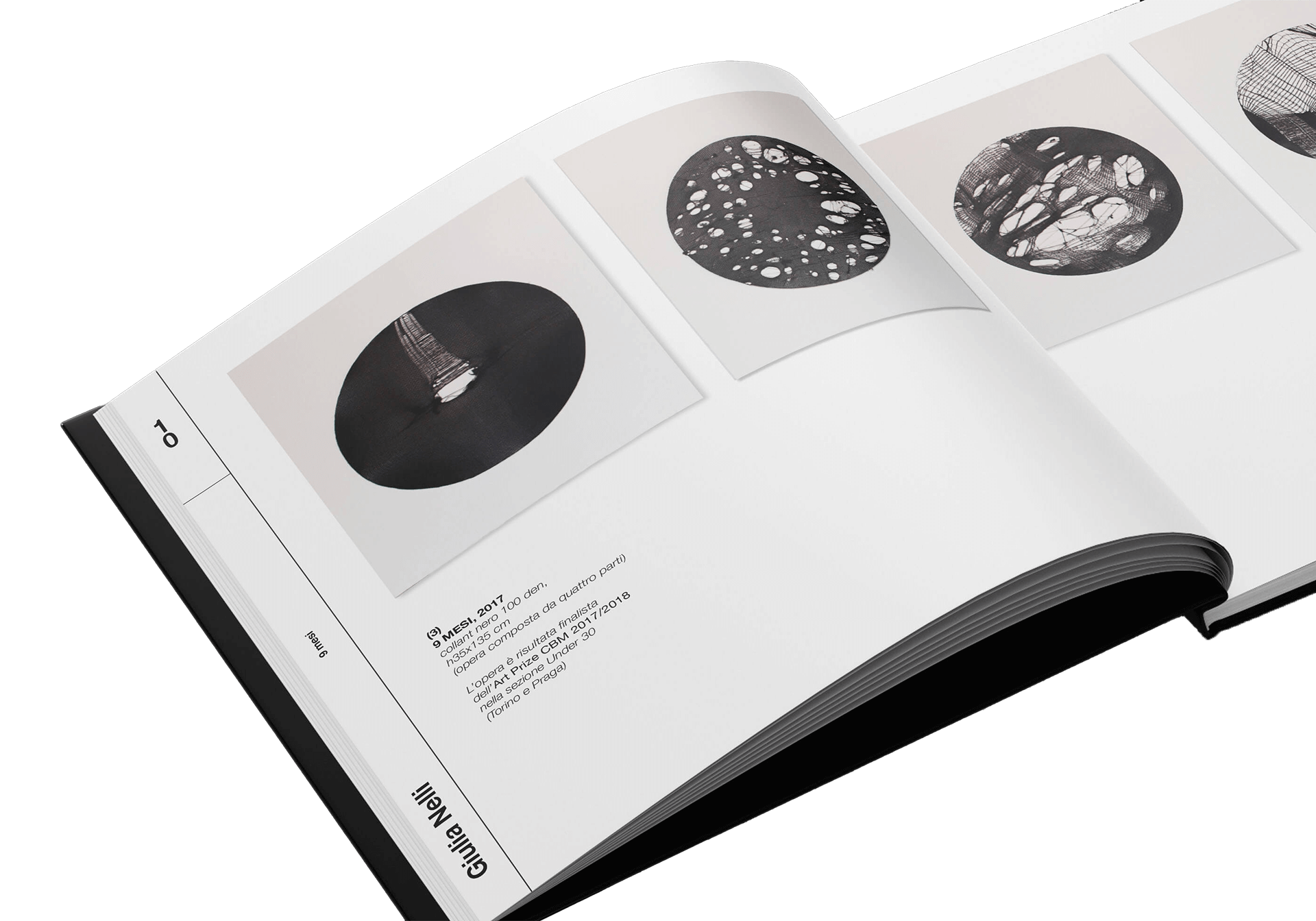 The project was developed as part of a collaboration with Domino Communication, a communication agency involved in the editorial production. The publication was designed with a rigorous, minimal approach, leaving ample space for the artworks and reducing visual elements to what is essential. The choice of Helvetica Neue and a black-and-white palette defines a sharp, contemporary tone, supported by a clean grid and clear hierarchies between texts, captions, and images. The result is a coherent, elegant editorial object, functional to reading and conceived to highlight rhythm, contrast, and the finer details of the artist’s work.